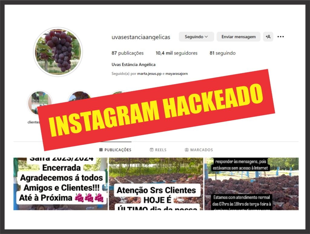 A ‘Uvas Estância Angélica’ está tomando as providências para tentar reaver a conta do Instagram ou tirá-la do ar. “Quem puder, denuncie a conta @uvasestanciaangelicas como ‘enganoso ou possível golpe’ diretamente no Instagram”, reforçou Celso Cortada.
