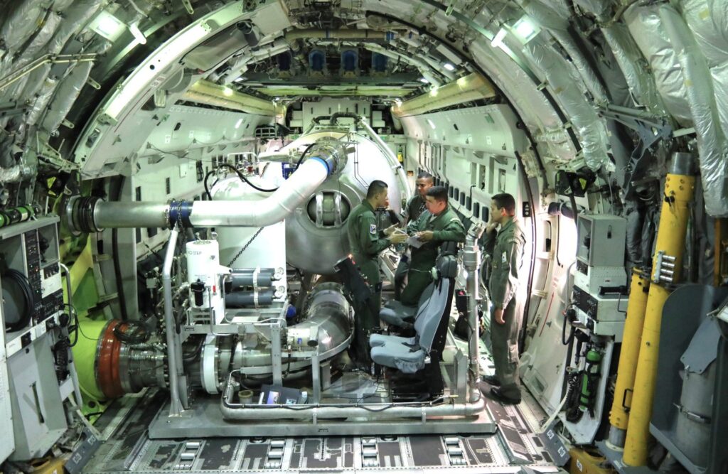 A aeronave é operada por seis tripulantes, sendo dois pilotos, uma mecânica de voo e três mestres de cargas. Eles vieram de Anápolis (GO) a Corumbá. No cockpit ficam os pilotos e a mecânica de voo, responsável pela preparação técnica e monitoramento da aeronave. “A gente faz todo um pré-voo antes do outro voo em si. Verificamos as condições da aeronave no solo, administramos o combustível e todos os sistemas do avião, e quando estamos em condições de voar, os pilotos assumem as posições de 1P e 2P (1° e 2° pilotos) e eu fico monitorando durante o voo os sistemas do avião”, explica Monalisa Alves Tabaco.