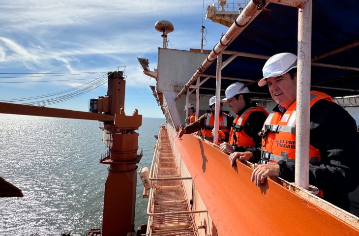 Nesta quarta-feira (14), ao lado dos secretários Rodrigo Perez (Gestão Estratégica) e Desenvolvimento (Jaime Verruck), Riedel conheceu o porto flutuante – onde é feita a transferência do mninério de ferro – e toda a estrutura da embarcação, incluindo a casa de máquinas e sala de controle. O governador ainda pode observar de perto toda a operação de transbordo do navio para o porto, e depois para a embarcação que leva o minério para a China e Europa.