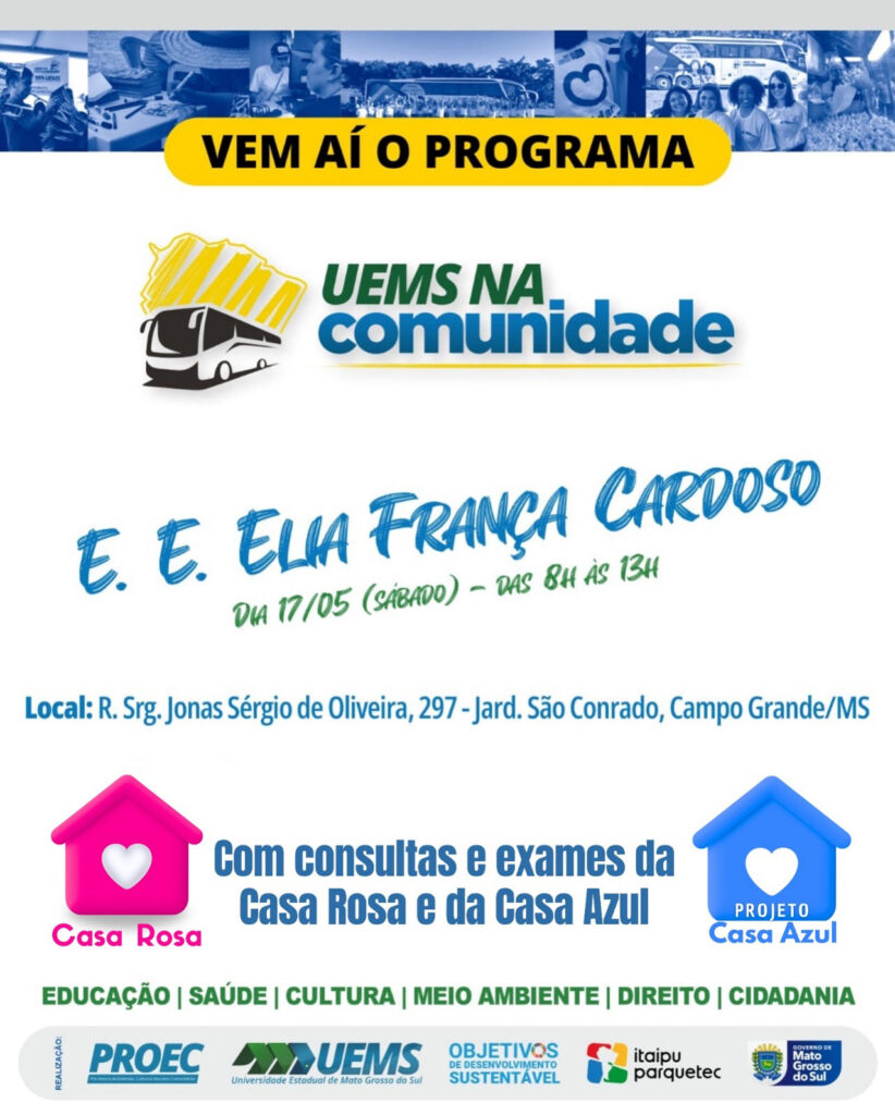 No próximo sábado, dia 17 de maio, das 8h às 13h, a população do Jardim São Conrado e região contará com uma manhã repleta de serviços gratuitos durante o programa “UEMS na Comunidade”, que será realizado na Escola Estadual Elia França Cardoso, em Campo Grande.
