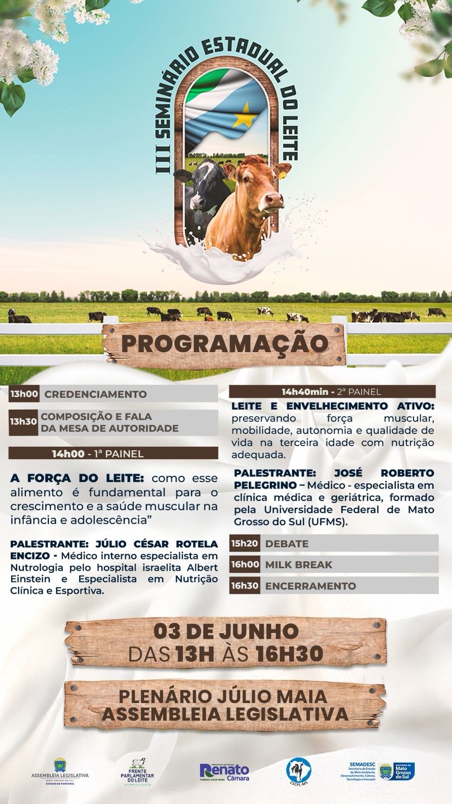Amanhã (3) acontece o III Seminário Estadual do Leite, a partir das 13h, no Plenário Júlio Maia. O deputado Renato Câmara (MDB), coordenador da Frente Parlamentar do Leite, é o proponente do evento, que conta com o apoio da Câmara Setorial da Cadeia Produtiva do Mato Grosso do Sul (CSPLMS), e da Secretaria de Estado de Meio Ambiente, Desenvolvimento, Ciência, Tecnologia e Inovação (Semadesc).