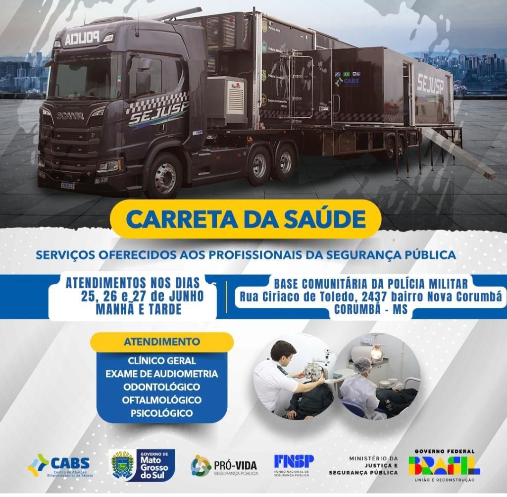 A Secretaria de Estado de Justiça e Segurança Pública (Sejusp-MS), por meio do Centro de Atenção Biopsicossocial (CABS), realiza, nos dias 25, 26 e 27 de junho, a quarta edição do projeto Carreta da Saúde, em Corumbá.