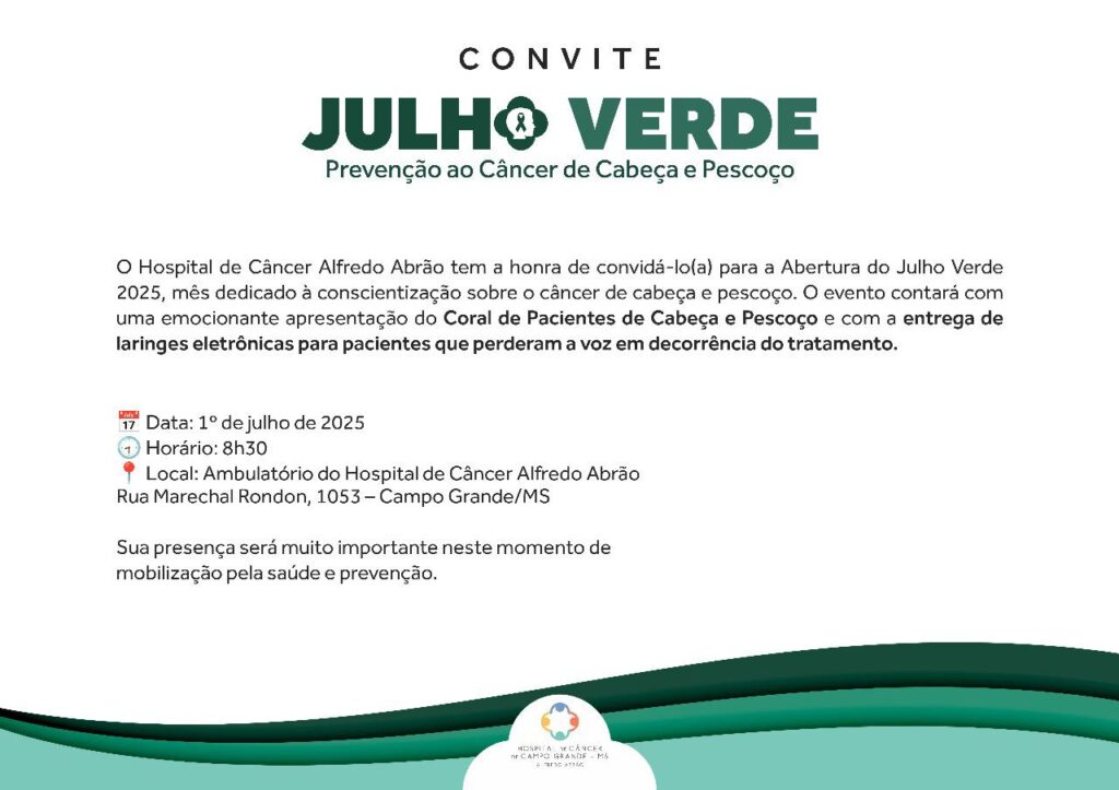 Julho Verde: Hospital de Câncer de Campo Grande- Alfredo Abrão abrirá mês de conscientização sobre o câncer de cabeça e pescoço