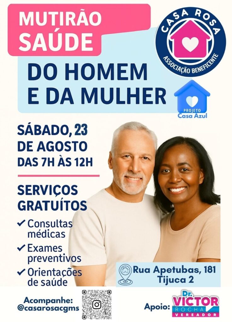 A Associação Beneficente Casa Rosa, referência nacional no atendimento gratuito à população, realiza neste sábado, 23 de agosto, mais um Mutirão de Saúde do Homem e da Mulher, em parceria com o Projeto Casa Azul. A ação acontece na sede da instituição, localizada na Rua Apetubas, 181 – Tijuca 2, das 7h às 12h, oferecendo consultas médicas, exames preventivos e orientações de saúde totalmente gratuitas.